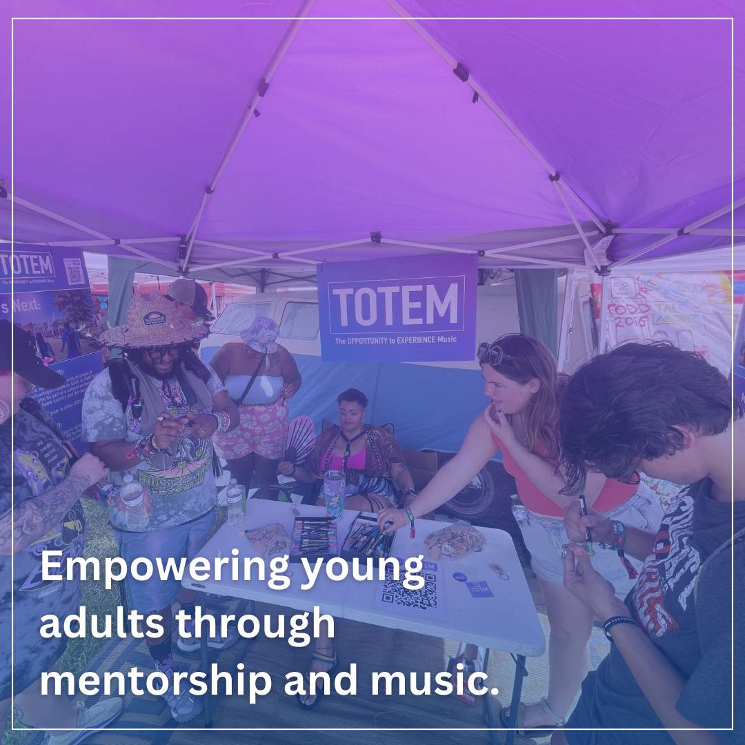 At a music festival, a totem is a personalized home-made sign that allows friends to find one another in a crowd. It’s a beacon that means a lot to a group of friends and keeps them together. We love the metaphor and think it makes a lot of sense for what we want to do. TOTEM is an acronym for The Opportunity to Experience Music, and was created by board members J.B., Evan, and Skyler.